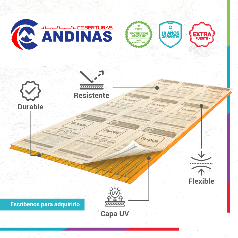 Los paneles de policarbonato alveolar, además de ser muy resistentes y flexibles, garantizan una excelente transmisión de luz y mayor brillo. Cuentan con protección UV para asegurar una garantía de hasta 10 años. Dichas propiedades pueden graduarse gracias a que contamos con un amplio portafolio de colores y espesores, brindando de esta manera soluciones diversas a nuestros clientes.