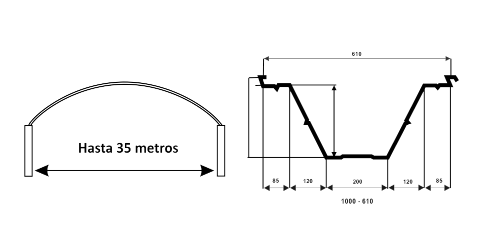 Nuestra cubierta autoportante membrana o arcotecho, tipo membrana, ofrecen superiores ventajas sobre otras técnicas tradicionales. Este tipo de techo es apoyado sobre muros ó vigas actuando como soporte del techo. Se fabrica con flechas del 20% al 35% del ancho total de la “luz”. No necesita Apoyos intermedios con luces de hasta 38 metros.