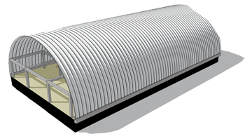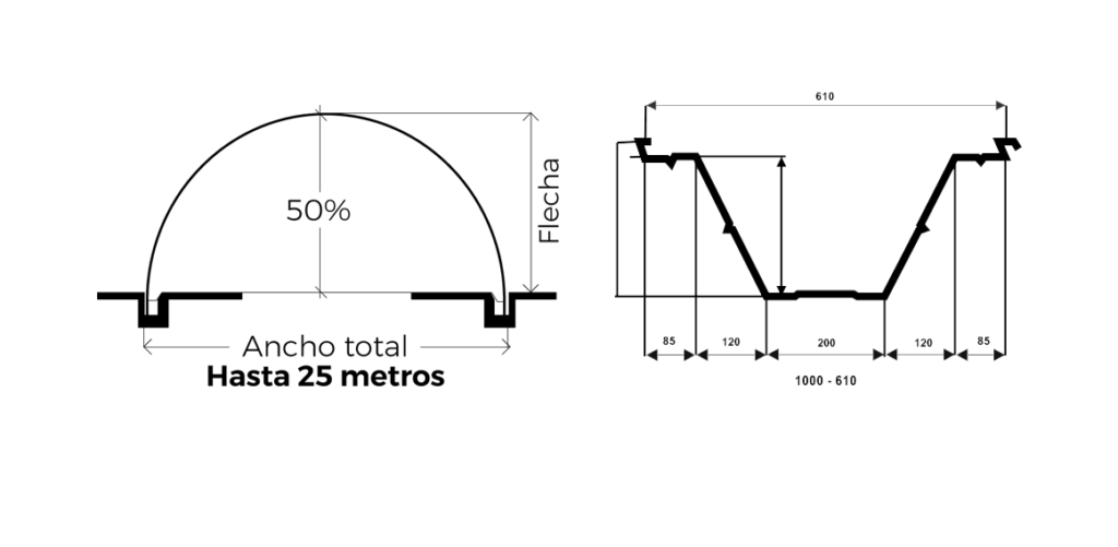 Nuestra cubierta autoportante semicircular (arcotechos) o al 50% ofrecen superiores ventajas sobre otras técnicas tradicionales. Este actúa como muro y techo de poca altura y con una flecha entre 35% hasta 50% de luz libre. Son cubiertas que se colocan sobre una cimentación corrida por lo que el arco actúa como muro y cubierta a la vez.